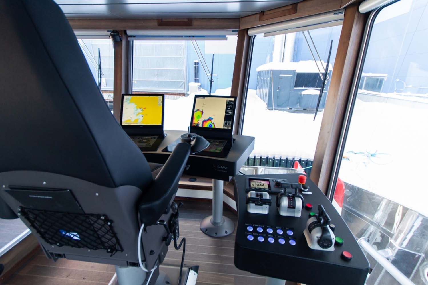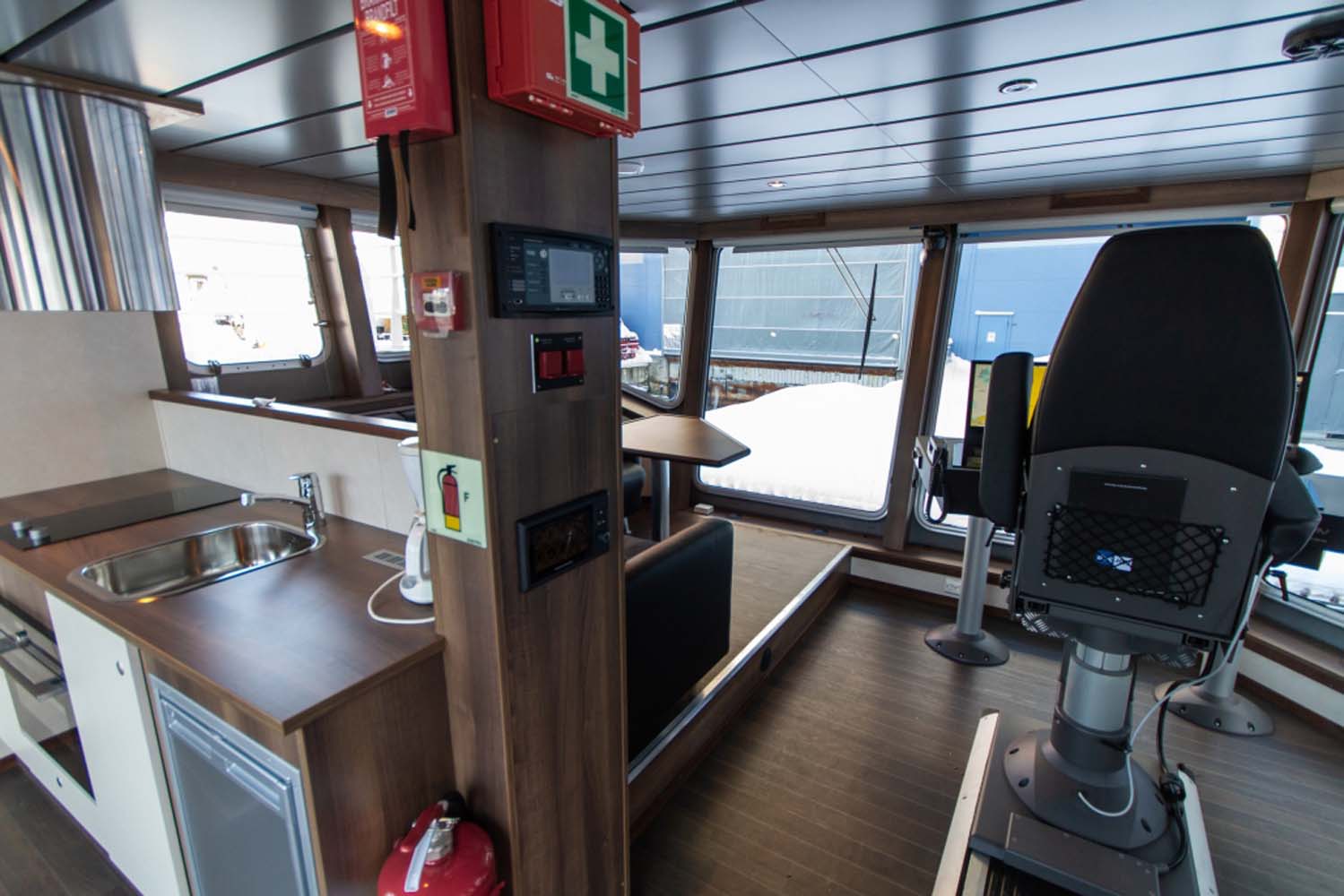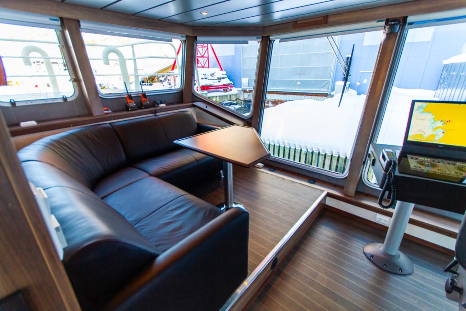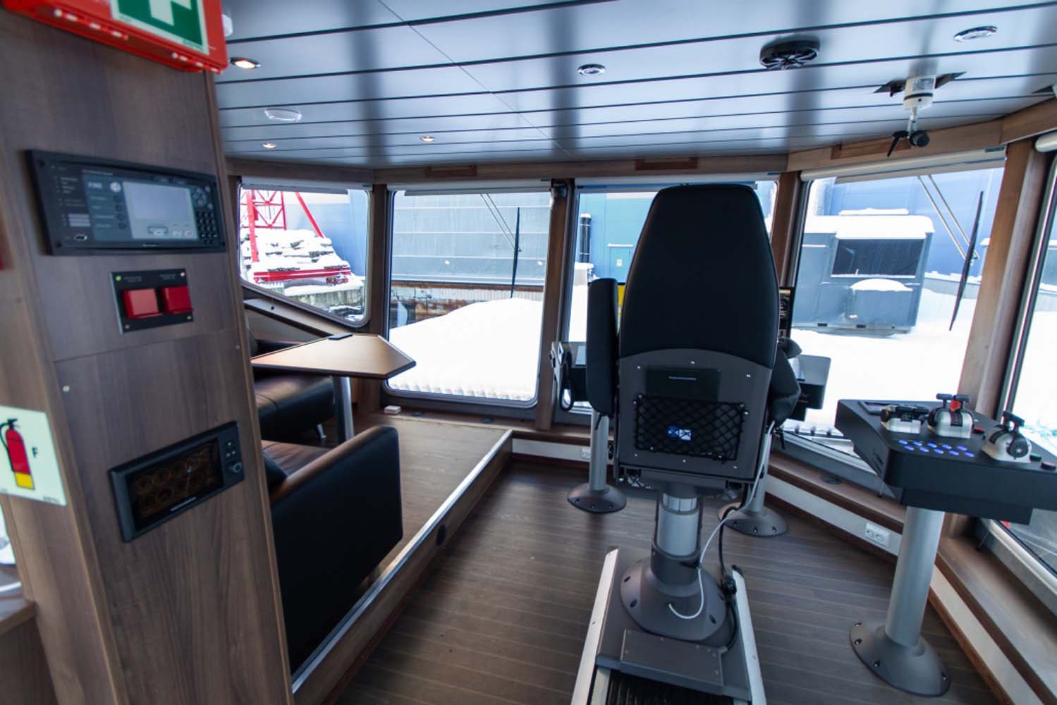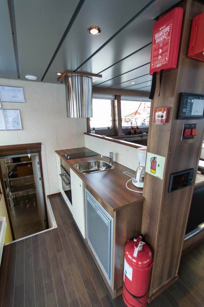 Båten er bygget med et romslig rorhus med pentry og sittegruppe. I tillegg er det et stort dekkshus som inneholder tørkerom kombinert verksted, samt et toalett.
