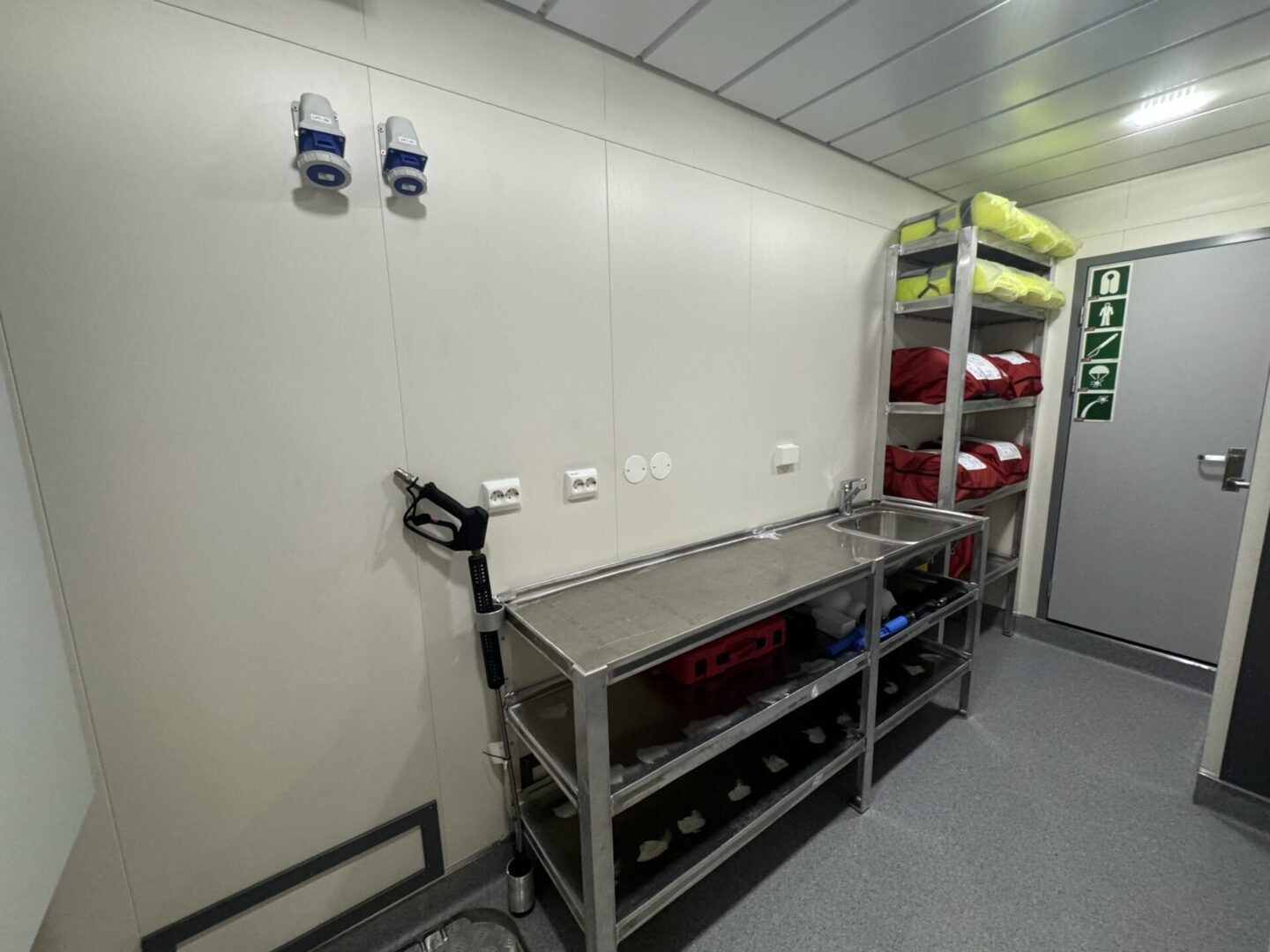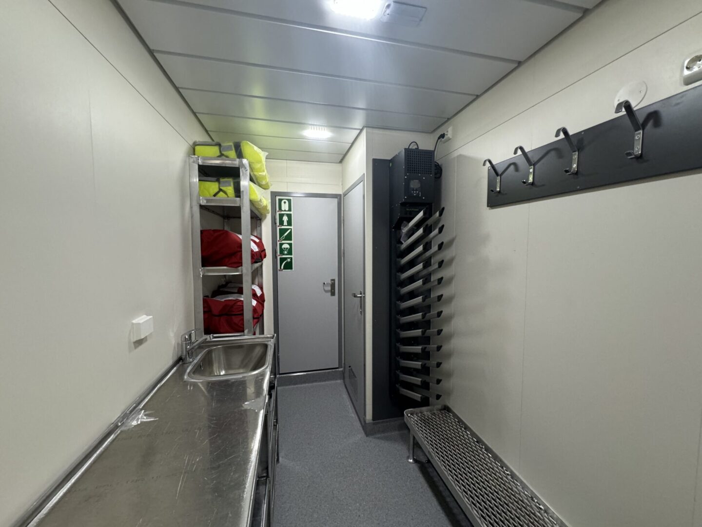 Dekkshuset er romslig og inneholder kombinert garderobe og verksted med stor arbeidsbenk, vask og hansketørker, samt toalett.